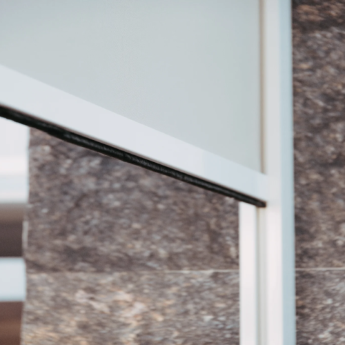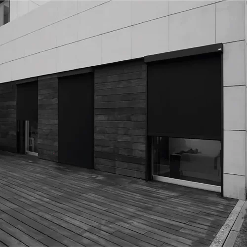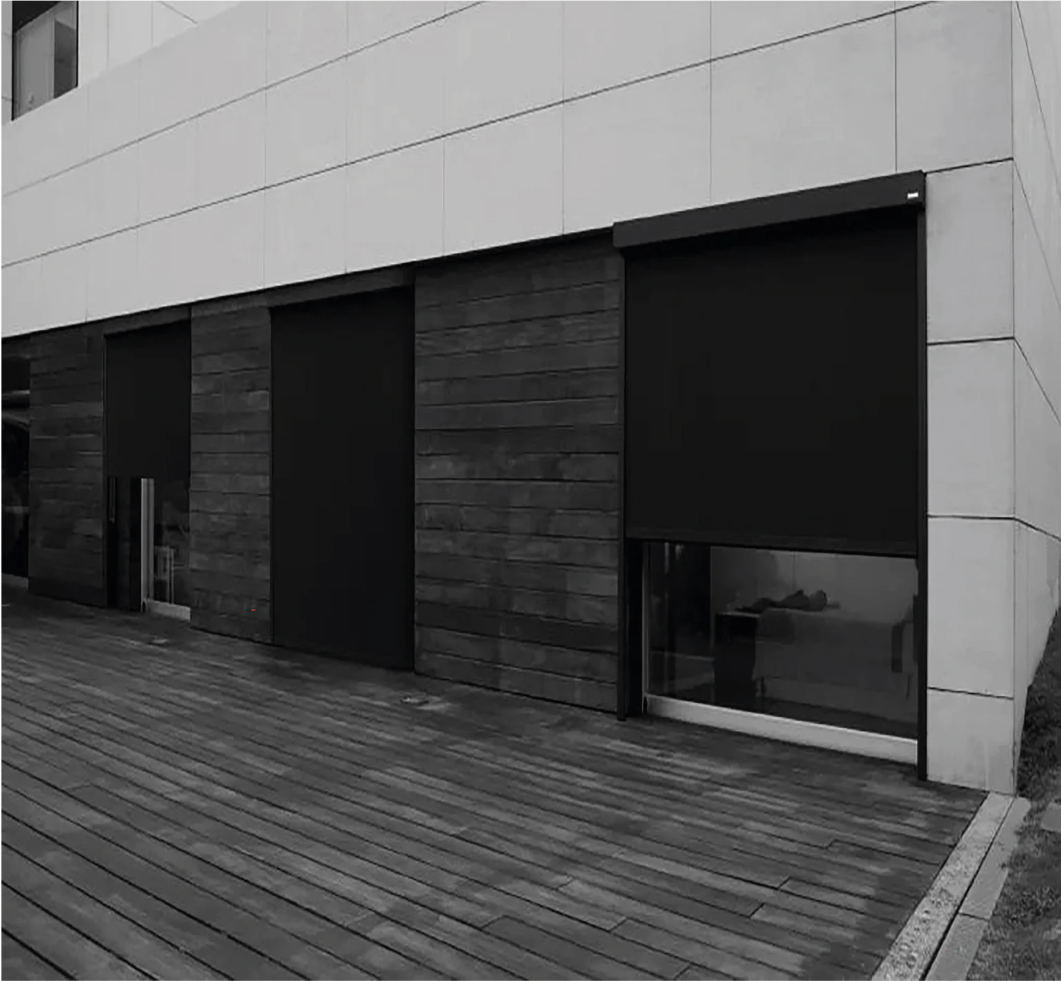Cortina enrollable motorizada con cajón y guías laterales, aptas para interiores y exteriores, garantiza resistencia y vientos hasta 50 km/h. Gracias a su cajón y guías garantiza una total oscuridad.