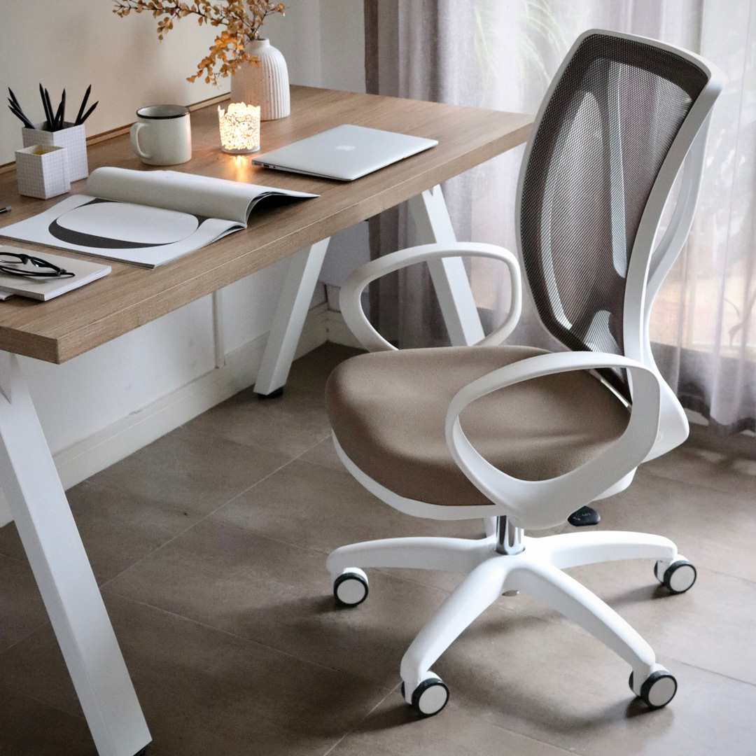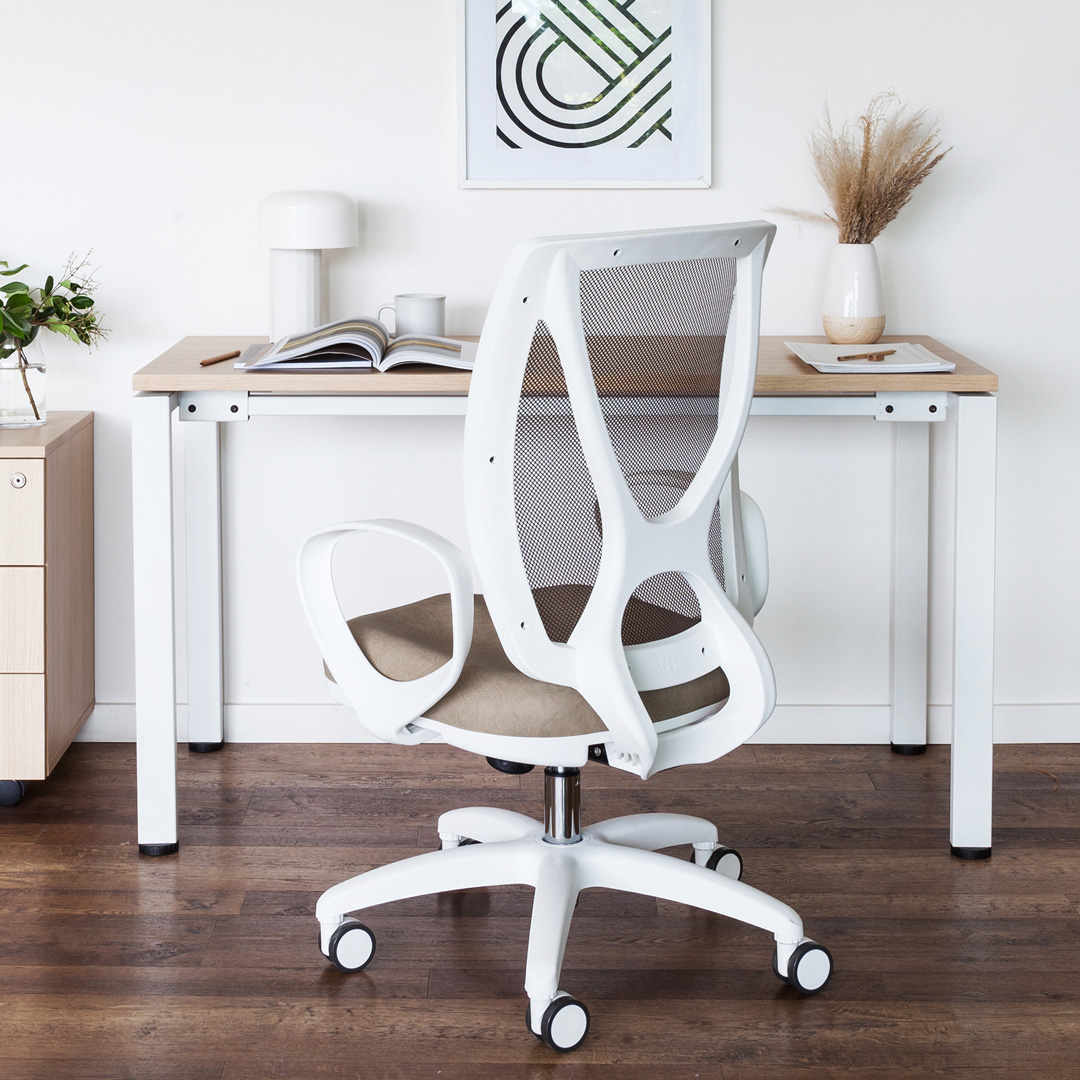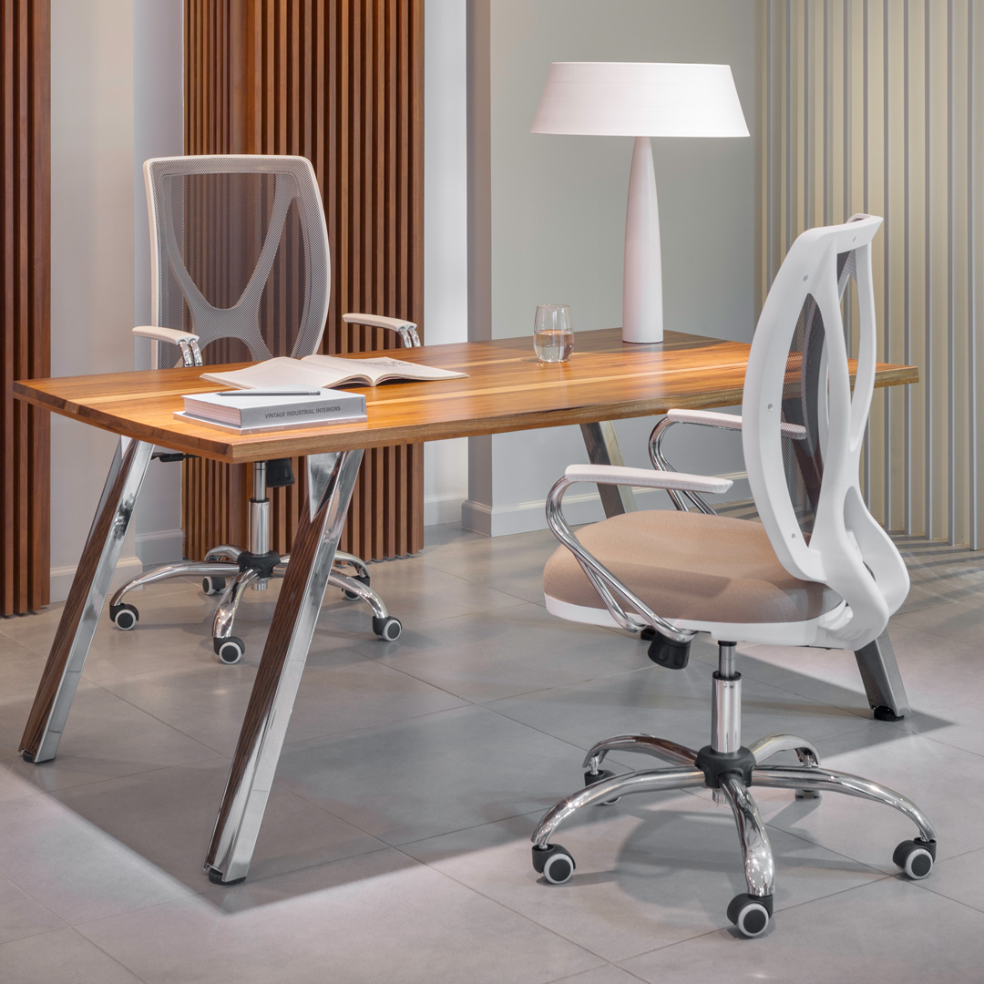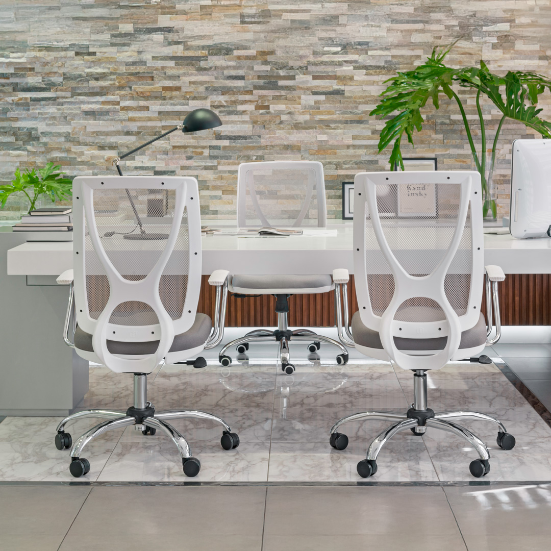 Silla ejecutiva que combina diseño estético y comodidad. Su respaldo alto brinda soporte completo para la espalda, mientras que su asiento ergonómico garantiza confort durante largas jornadas. Disponible en estructura negra o blanca.