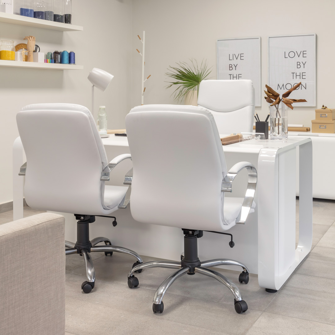 El sillón gerencial ideal para tu oficina o sala de reuniones. Tapizado en ecocuero, disponible en estructura blanca o negra y con respaldo alto o bajo, aportando un toque moderno y profesional.
