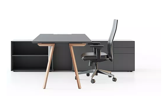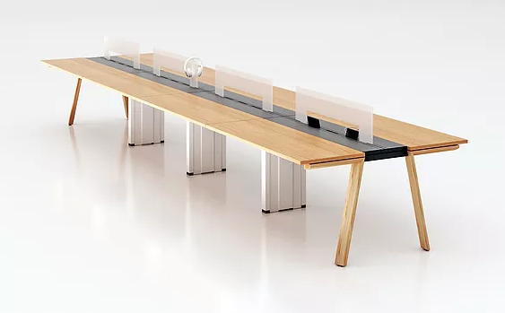 Que permite una integración secuencial y progresiva de sus componentes, priorizando los planos de trabajo y delimitando visualmente las zonas de acceso a la conectividad y a las herramientas auxiliares.